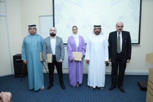 محمد عبدالله البريكي يتوسط الشعراء ومقدمتهم بعد تكريمهم من اليمين د. أكرم قنبس و هاجر الرئيسي وسليمان الإبراهيم ومظفر الحمادي