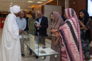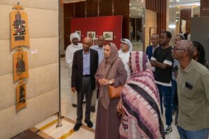 د. فاطمة الصايغ و د. يوسف عايدابي وتاج السر حسن وهناء وقيع الله خلال افتتاح المعرضفاطمة الصايغ تقدم درع العويس لهناء وقيع الله بحضور د. يوسف عايدابي وابراهيم الهاشميجانب من المعرض