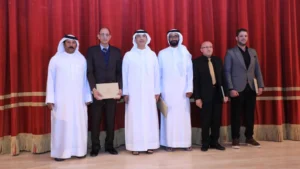 عبدالله العويس بحضور محمد عبدالله البريكي يتصدر الشعراء ومقدمهم بعد تكريمهم من اليمين جعفر حمدي و د خليفة بوجادي وعمر المقدي و د. أحمد سعد الدين