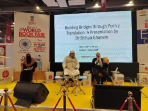 حضر وفد “اتحاد كتاب وأدباء الإمارات” حفل الافتتاح الذي رعته رئيسة جمهورية الهند دروبادي مورمو، وشارك في الجلسة الأولى د. شهاب غانم متحدثا حول (بناء الجسور الثقافية الإماراتية الهندية) من خلال الترجمة الشعرية و تجربته حول العلاقة بين الثقافة الإماراتية والثقافة الهندية ثم استعرض الحركة الشعرية في الإمارات وترجمتها إلى أكثر اللغات و اللهجات استخداما في الهند.