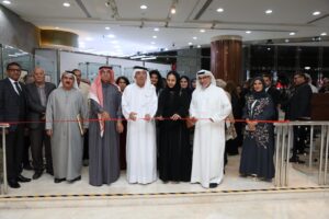 عبدالغفار حسين يفتتح المعرض إلى يمينه عبدالحميد أحمد وإلى يسارره د. فاطمة الصايغ و إبراهيم الهاشمي
