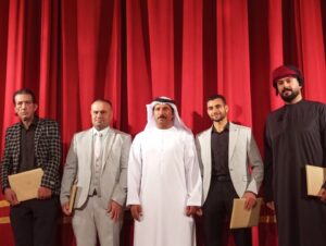 محمد عبدالله البريكي يتوسط الشعراء ومقدمهم بعد تكريمهم من اليمين حسام الشيخ و همام صادق و يوسف علي الغضبان ومهند الشريف