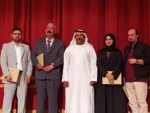محمد عبدالله البريكي يتوسط الشعراء ومقدمهم بعد تكريمهم من اليمين د. محمد سعبيد العتيق و د. عائشة الشامسي و يوسف عبدالعزيز و رغيد جطل