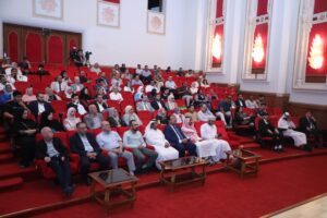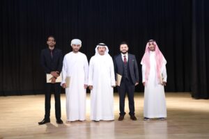 محمد غبدالله البريكي يتوسط المشاركين بعد تكريمهم من اليمين علي أخند بالبيد و حمزة اليوسف و د.منتظر الموسوي و محمد المؤيد المجذوب