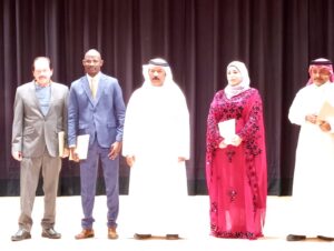 محمد عبدالله البريكي يتوسط المشاركين بعد تكريمهم من اليمين حسن القرني و ليننا فيصل و بحر الدين غبدالله ومحمد إدريس