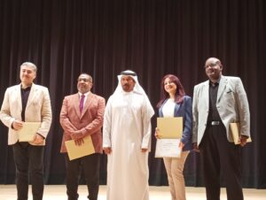 محمد عبدالله البريكي يتوسط المشاركين بعد تكريمهم من اليمين د. ناشد أحمد عوض و وراد خضر و عبدالله عبدالصبور و لؤي شانا