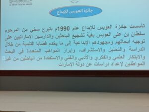 وأضاف البدور أن احتفال الندوة بهذه المناسبة يتم عبر فعاليات عدة، منها هذه الفعالية التوثيقية لجائزة العويس للإبداع التي تأسست عام 1990م، بتبرع سخيّ من المرحوم سلطان بن علي العويس بغية تشجيع الباحثين والدارسين الإماراتيين على توجيه أبحاثهم وجهودهم الإبداعية لما يخدم قضايا التنمية من خلال الدراسة والتحليل والاستشراف، وإبراز المواهب المتعددة في البحث والابتكار العلمي والفكري والأدبي والفني.
