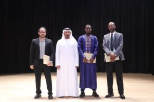 محمد عبدالله البريكي يتوسط المشاركين بعد تكريمهم من اليمين د. مازن صلاح الدين و كرمبا دافي و مصطفى الحفناوي