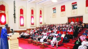 واعتلى المنبر الشاعر كرمبا دافي، وهو من طلاب الجامعة القاسمية في الشارقة، واستهل إلقاءه بقصيدته من المديح النبوي “النعمة الكــــــبــرى محمد” التي ينسج يها بكلماته اندماجه في العالم القدسي للرسول صلى الله عليه وسلم: