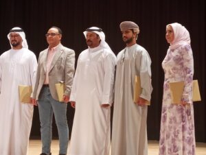 محمد عبدالله البريكي يتوسط المشاركين بعد تكريمهم من اليمين قمر صبري و محمد المعشري و د.محمد محمد عيسى و محمد المنصوري