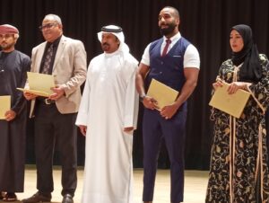 محمد عبدالله البريكي يتوسط المشاركين بعد تكريمهم من اليمين د. آمنة حزمون و أحمد اليمني و د. خليل الرفوع و هشام الصقري