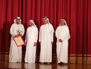 الشيخ هيثم بن صقر القاسمي و عبد الله بن محمد العويس و أحمد بو رحيمة خلال تكريم عبدالحميد البلوشي