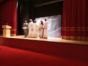 محمد عبدالله البريكي يتوسط المشاركين بعد تكريمهم من اليمين طلال الصلتي و طيبة جليل وعلي حسن المؤلف وأحمد شبيب