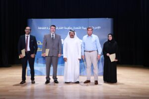محمد عبدالله البريكي يتوسط المكرمين من اليمين شيخة المطيري و محمود صالح وفاتح البيوش و د. علي الشريف