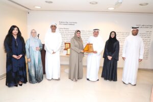 ميساء السويدي تكرم أحمد الأنصاري ومن اليمين سالم الجنيبي و علياء الملا عبدالرحيم سالم و د. نجاة مكي و د. نهى فران